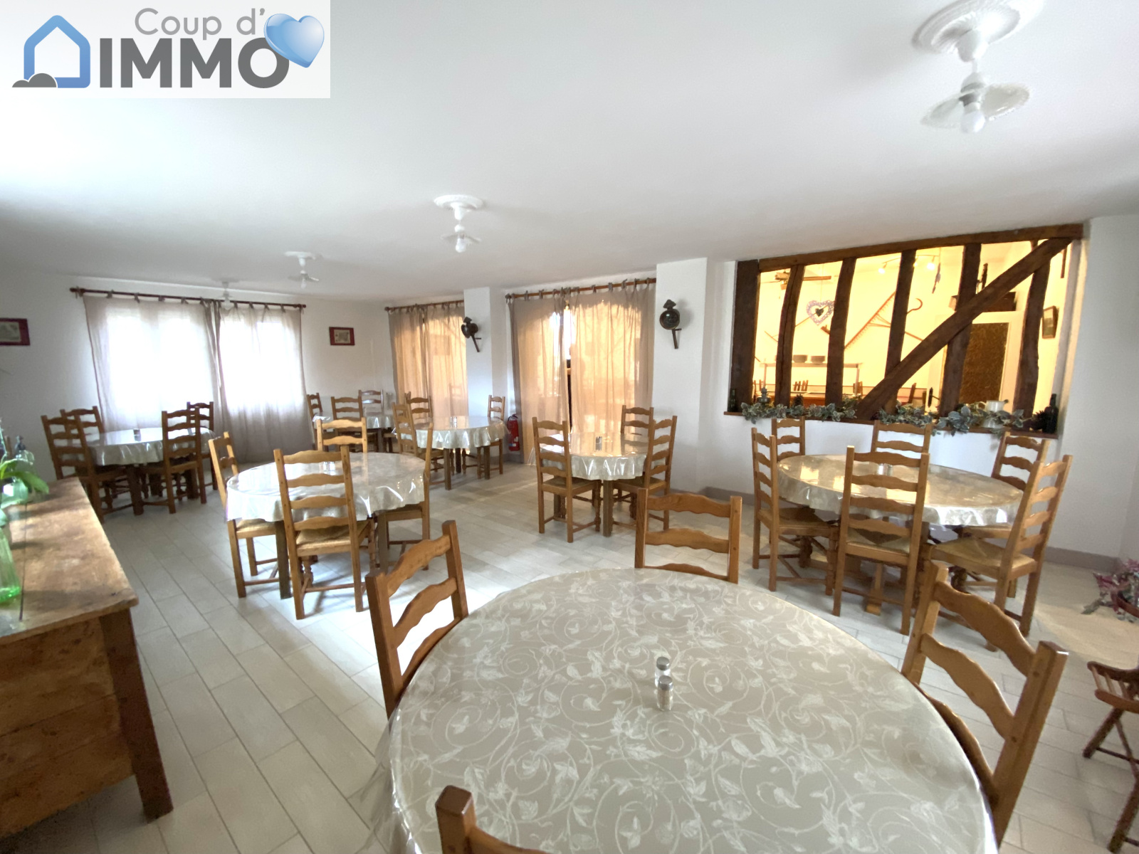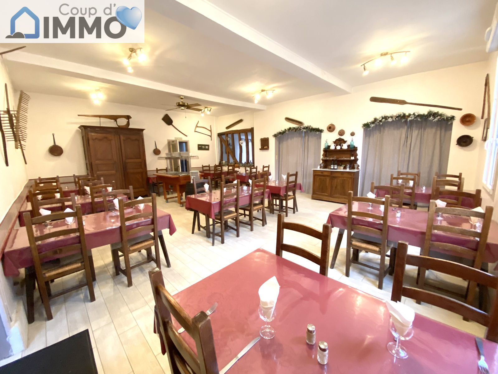 Accueil avec cheminée imposante, entrée indépendante sur salle de BAR de 27m², DEUX BELLES SALLES DE RESTAURATION avec une capacité d’environ 40 couverts chacune, sanitaires neufs, grande cuisine avec matériel complet en excellent état, réserve avec chambres froides, CAVE.